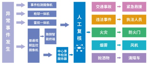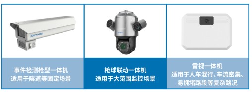 根据不同道路场景,设置不一样的监控一体机产品,例如:对于隧道等环境较为阴暗狭小的固定场景路段,采用事件检测枪型一体机;对需要大范围监控的场景,采用枪球联动一体机,多角度监控;对于人车混行、车流量密集、易拥堵等情况较为复杂的路段,则使用雷视一体机。依据道路复杂程度特别设置不一样类型的一体机,依靠前端智能摄像机实现事件检测分析,所有检测都在前端相机内部完成,不受传输网络影响,处理及时,准确率高并支持卡口功能,作为违法取证的依据。